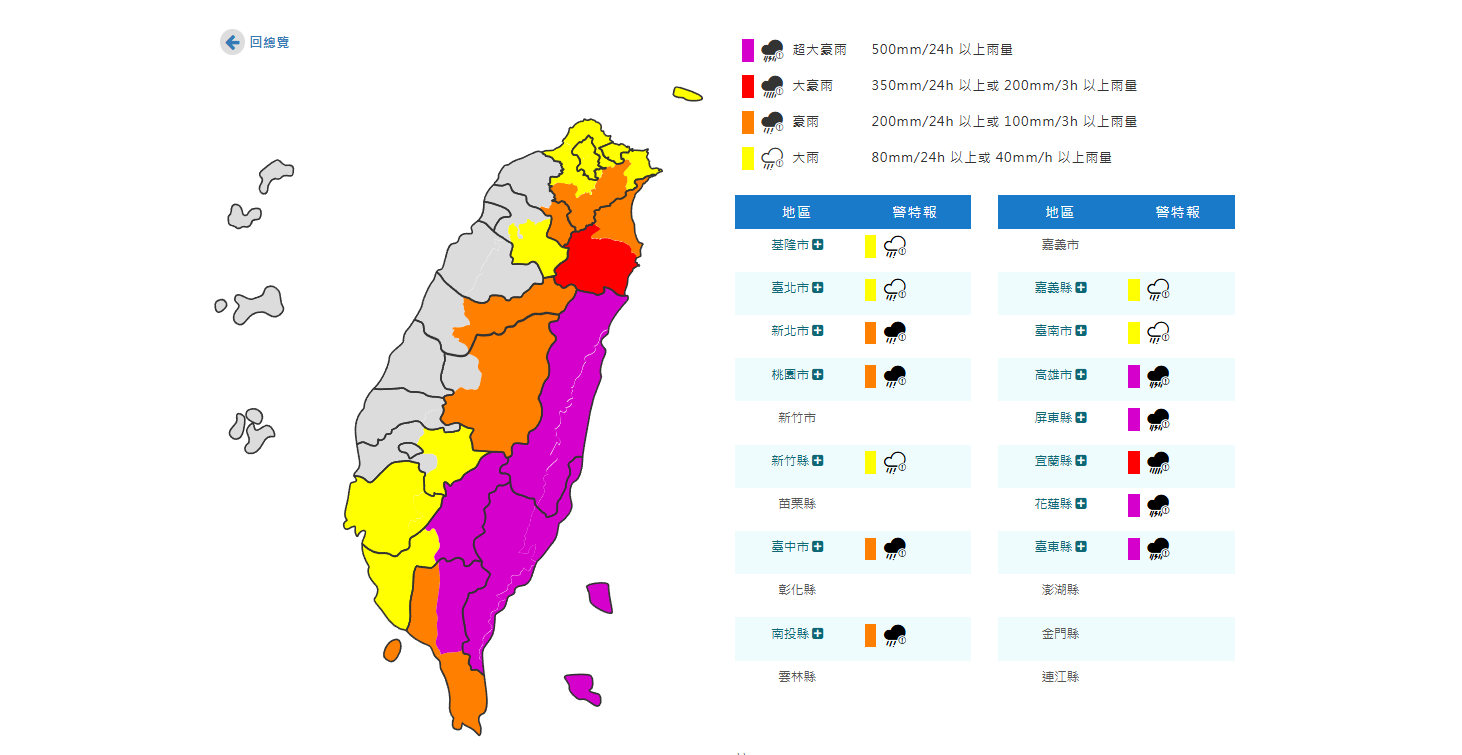 超大豪雨、大豪雨、豪大雨警戒區有哪些?