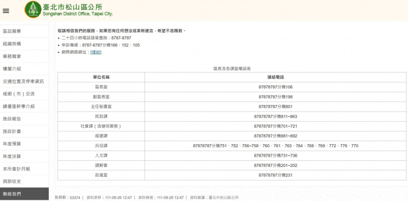 台北市松山區公所聯絡電話。(圖/擷取自台北市松山區公所)